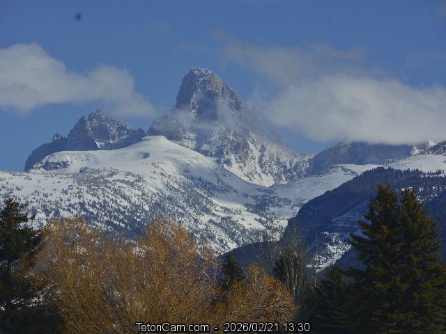 View from the summit of Fred's Mountain at Grand Targhee Ski Resort, movable cam located 7 miles WNW of the Grand Teton, view rotates every 30 seconds with a stunning closeup shot of the Tetons