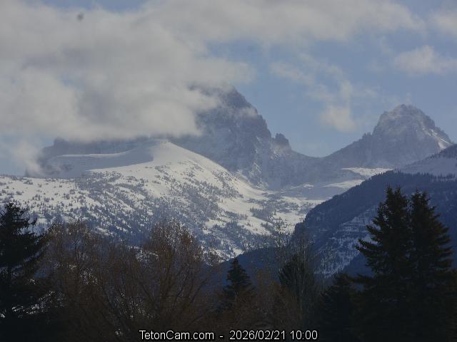 View from the summit of Fred's Mountain at Grand Targhee Ski Resort, movable cam located 7 miles WNW of the Grand Teton, view rotates every 30 seconds with a stunning closeup shot of the Tetons