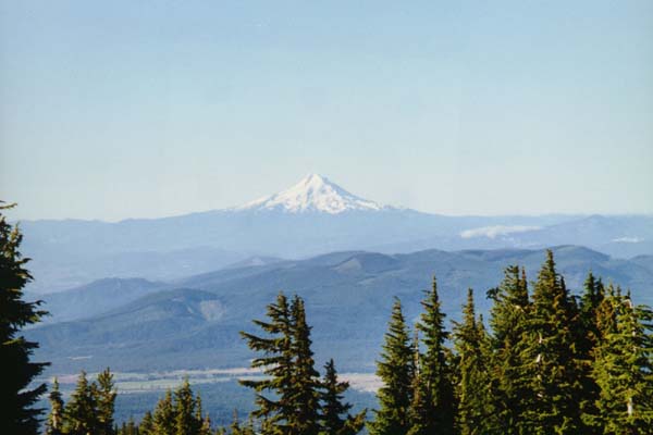 In 1998 we headed down to Mount Adams again. This time we planned a one-day ski trip instead of an overnight as in 1997, climbing the South Rib and skiing down the Southwest Chutes. Due to the later date and lower snowfall, we could drive all the way to the trailhead at Cold Springs, although the last few miles of road looked more like a dry streambed. We car-camped overnight, and headed up at about 7 AM on Sunday. This is a view looking south at Mount Hood early in the morning.Trip Introduction | Previous Page | Next Page