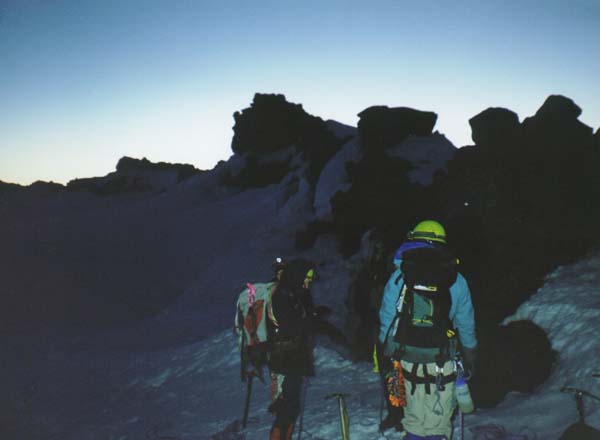 We walked through the night with crampons on firm snow, traversing the extremely crevassed Ingraham Glacier (see later photos) and then climbing bare rock and scree on Disappointment Cleaver up to 12000 ft. Looking down at Camp Muir after midnight , we could see a long train of headlamps snaking out of camp across the Cowlitz Glacier. Since we were out ahead of all other groups, we didn't have to worry about them accidentally kicking rockfall onto us, which is a common hazard on the Cleaver. After leaving the rock we followed the right edge of the Ingraham past the top of the Cleaver to 12800 ft, then traversed far to the left (southwest) to avoid seracs and the huge bergschrund crevasse above. This detour extended over half a mile, and we finallly ascended the upper Nisqually Glacier to the summit dome. We reached the southeast gap in crater rim (14180 ft) at 5:30 AM, finally permitting a photograph in the first light of dawn. All nine of us had made it up Rainier successfully!