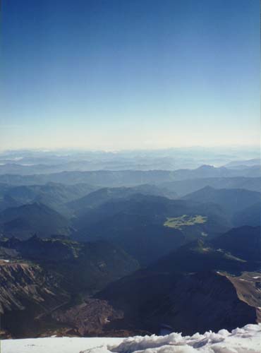 Looking north we see the rock-covered toe of the Winthrop Glacier nearly 10000 ft below us (at bottom), with the green oasis of Grand Park at right center. As we sat on the rim, groups of climbers began to arrive from the northeast, having climbed the popular Emmons-Winthrop Glacier route. Faintly visible in the distant haze are the snow-capped peaks of the central and northern Cascade Range.