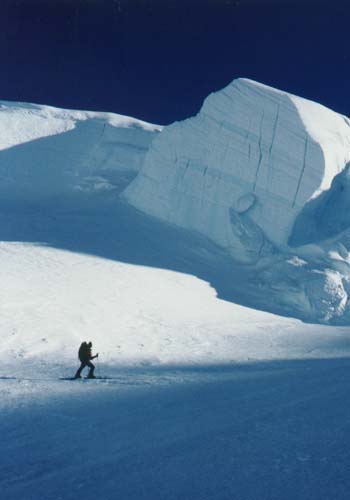 Since the slope had refrozen firmly, I decided to risk skiing directly below these huge seracs so that Tom could get this photo just as the sun set behind the ridge. As I stood there, the line of shadow kept chasing me closer and closer to the seracs until Tom finally snapped the photo.