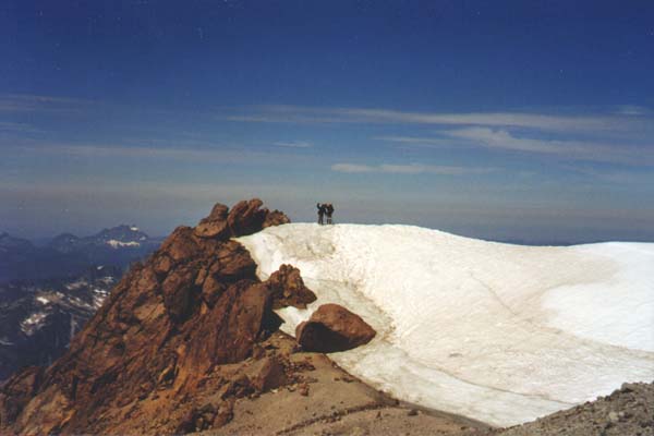 Near the top of the pumice ridge, we traversed right across a gully and then climbed to the rim of the ice-filled summit crater by noon. Here, I'm standing on the southeast edge of the rim, looking across at Bede and Basil standing just to the right of the true summit at the southwest corner of the rim (10541 ft).Trip Introduction | Previous Page | Next Page